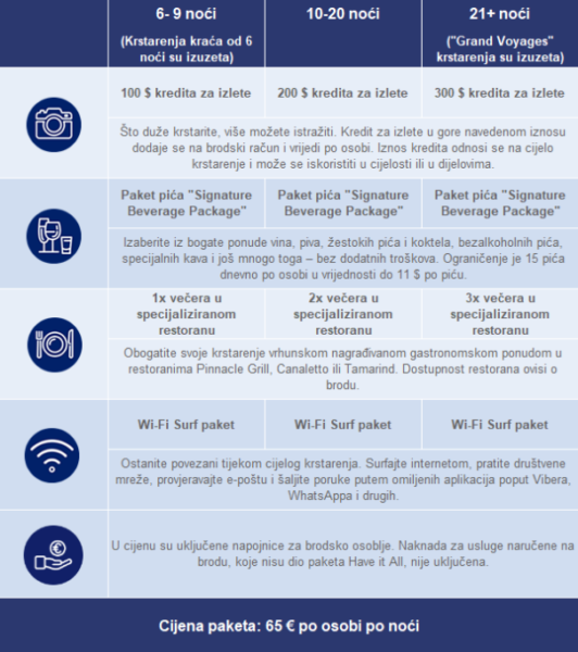 moguće doplate: napojnice u iznosu 112 USD po osobi*, fakultativne izlete u lukama, transfere u lukama do centra grada, pića na brodu i troškove u barovima i restoranima, osobne troškove tijekom putovanja (paketi pića, Internet paketi, korištenje saune, tretmani ljepote, wellness i spa usluge, telefoniranje, usluga pranja i glačanja odjeće, kupnja u trgovinama, troškovi carinjenja), putno zdravstveno osiguranje, osiguranje od otkaza i/ili osiguranje prtljage.